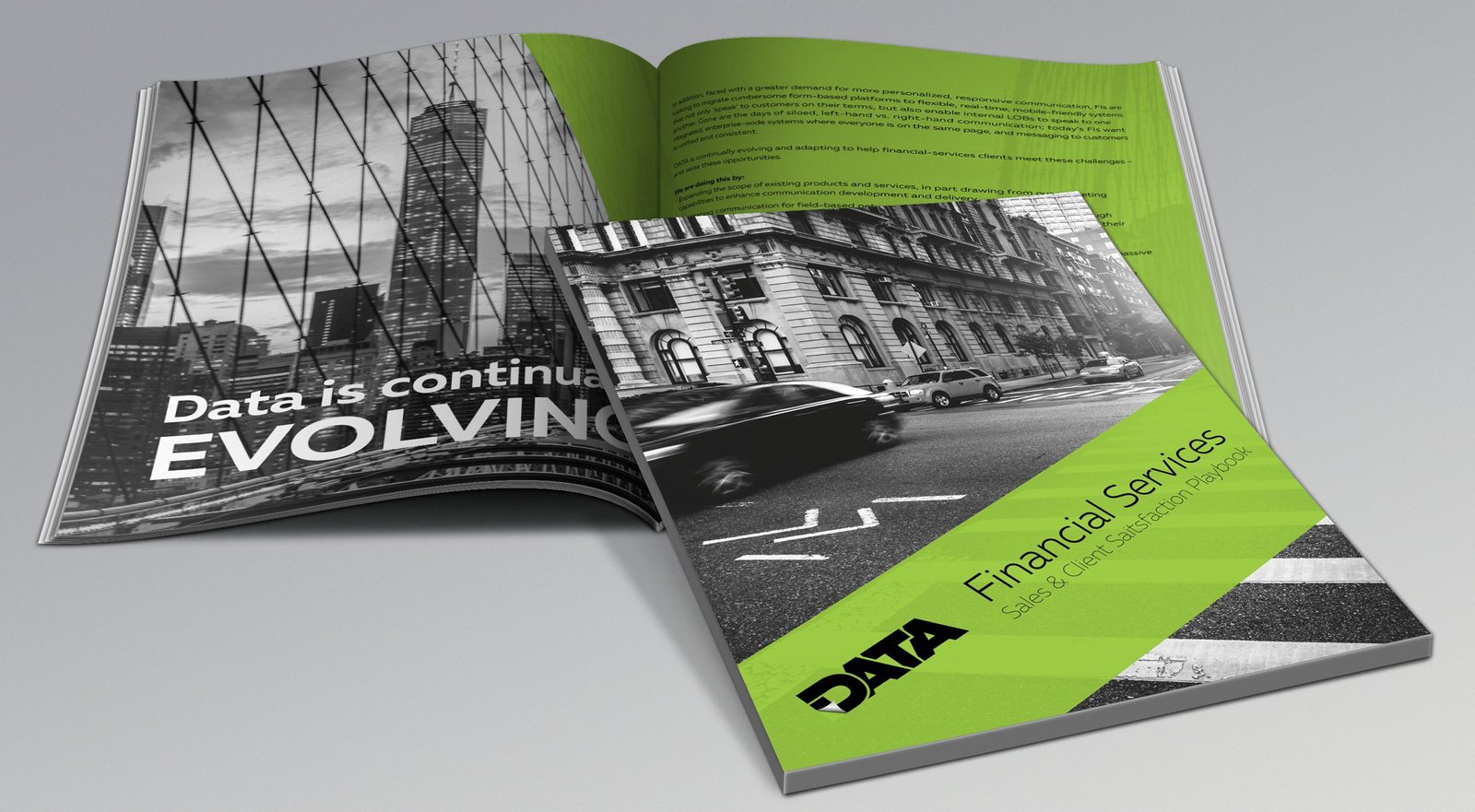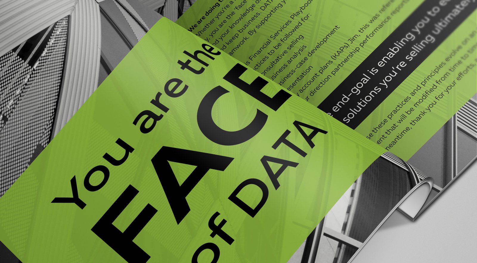 Data Data wanted to sell their financial services in a more dynamic and contemporary way. The use of black and white images with the use of a single color proved to be quite compelling and garnered attention across the company.